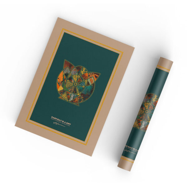The Boundary as a Gentle Embrace In the DOTA universe, boundaries are not walls; they are membranes. The soft transitions between colors and the space between the floating islands represent a sovereignty that is both strong and yielding. It serves as a visual metaphor for finding one’s own space a sanctuary where one can feel safe without feeling isolated. It is an invitation to inhabit one’s own skin with grace and peace. Sensory Balance and Regulation The rich, earthy palettes from deep velvet greens to warm, terracotta ochres are designed to ground the observer. Every golden point serves as a focal point for internal realignment. It is a sensory journey back to the essential self, supported by the silent promise written at the base of the work: “Each day is a gift. Open it with love and gratitude.”