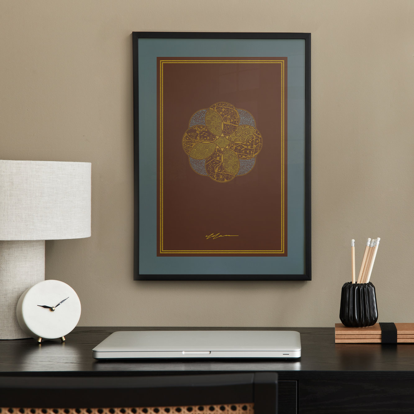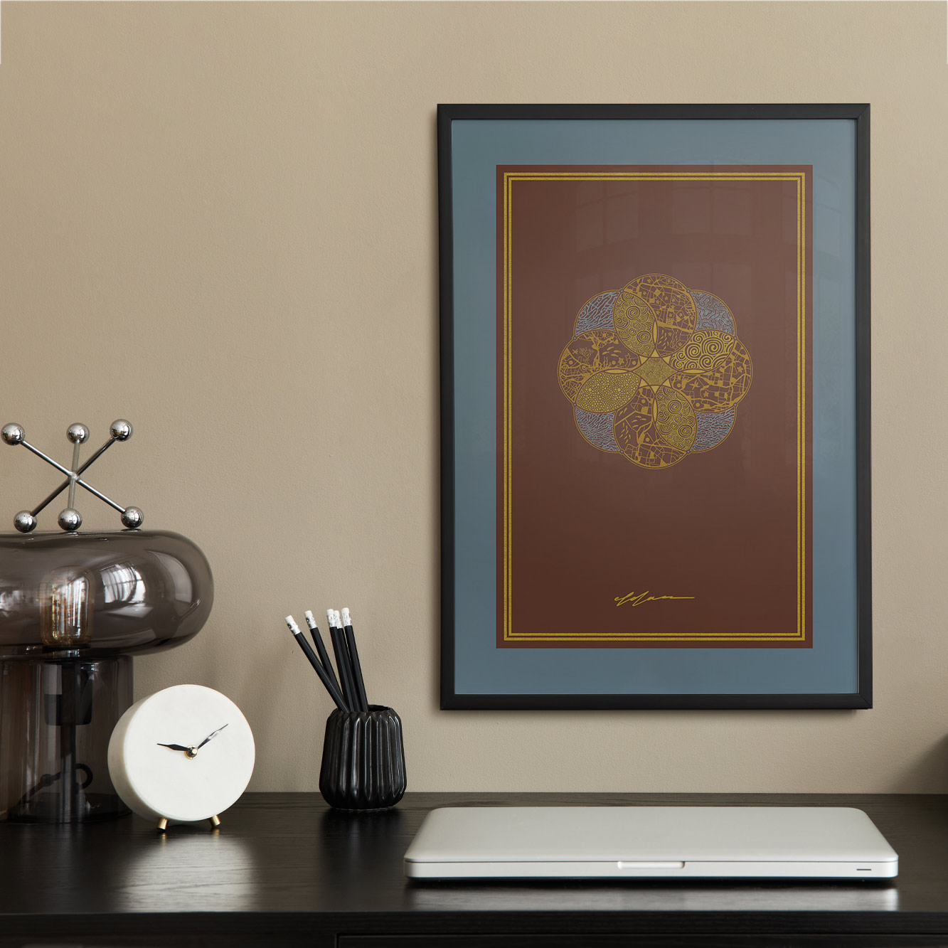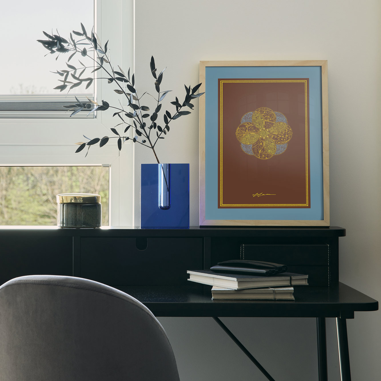 As an artwork, FAROHILDIS reveals its full effect in spaces where reflection and creativity are welcome. In living environments it creates warmth and harmony. In offices or studios it encourages creative thinking and reminds viewers of the importance of sustainable awareness. In waiting areas or quiet spaces it brings calm and a sense of balance.